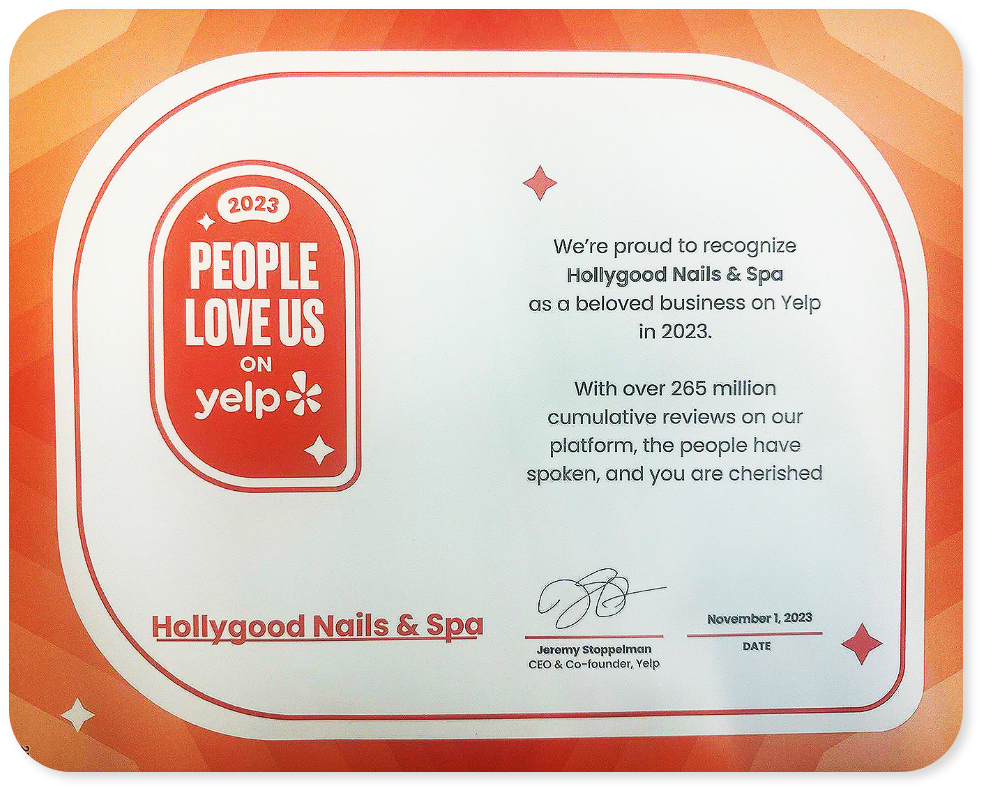 We're proud to recognize Hollygood Nails & Spa as a beloved business on Yelp in 2023. With over 265 million cumulatice reviews on our platform, the people have spoken, and you are cherished